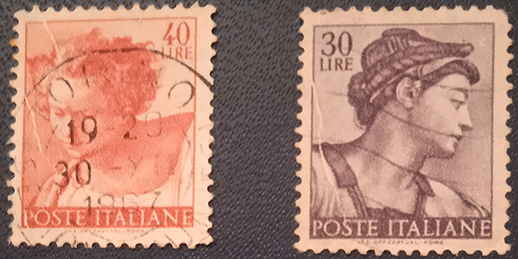 volevo sottoporle questi due francobolli della serie Michelangiolesca del 1961, il 30 lire e il 40 lire.