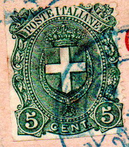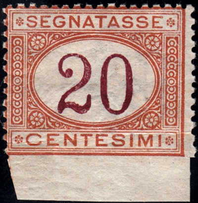 il francobollo con stemma di Savoia verde applicato sull’intero non è una varietà. Il francobollo presenta la dentellatura spostata nei due sensi, in basso ed a sinistra e per qualche motivo è stato ritagliato da questi lati. A sinistra si intravedono ancora alcune “lunette”, parti dei fori della dentellatura. Le varietà per i non dentellati e per essere considerate tali devono avere bordi bianchi di almeno 2 o più millimetri. Per visione un raro segnatasse da 20 centesimi non dentellato in basso (uno dei tre conosciuti, due nuovi ed uno usato).