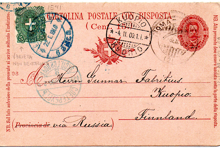 Su un intero postale di Umberto I (domanda + risposta allegata) inviata in Finlandia, ho riscontrato l'aggiunta di un francobollo da 5 cent verde (catalogo Sassone N° 67) che presenta il lato sx e quello inferiore non dentellati.