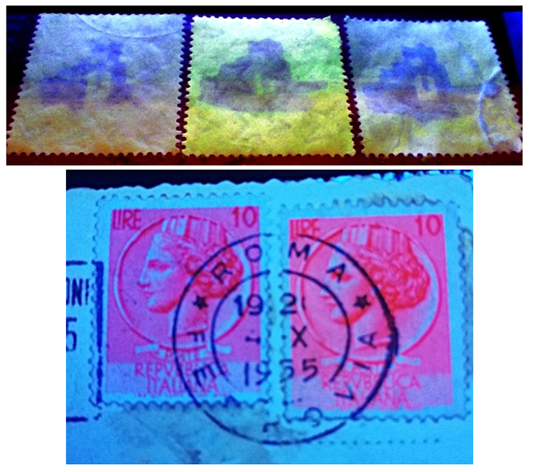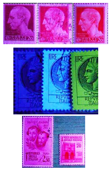 In allegato alcuni esempi di nostri francobolli stampati con la specifica inchiostrazione “rossa” U.V. In seguito il colore cambiò in bianco e poi ancora ingiallo, sia in patina che in pasta.