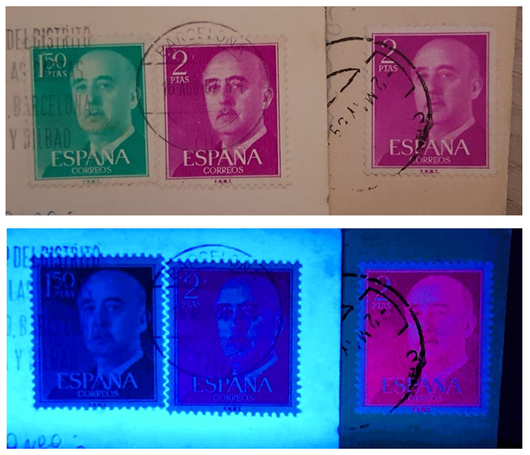 Una tiratura del francobollo da 2 ptas emesso nel periodo 1955/1975 dalla Spagna dedicato al Generale Francisco Franco con il ritratto del busto basato su fotografia di Juan Gyenes Remenyi sottoposto alla lampada di Wood ha il colore o il pigmento rosso fluorescente.