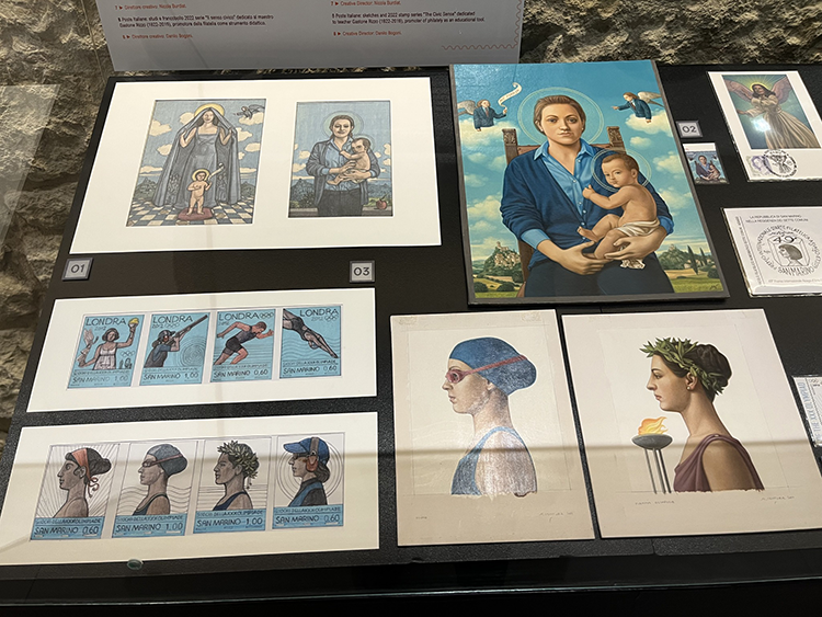 Nata quasi per caso, come ammette Roberto Ganganelli, conservatore del Museo del francobollo e della moneta della Repubblica di San Marino, in quanto sulle prime l’allestimento della personale di Marco Ventura preveda aver per sede Sansepolcro, città natale di Piero della Francesca, dove l’artista milanese è di casa. Venuta meno questa possibilità, ad aprire le porte è stato il Museo del francobollo e della moneta di San Marino, la sola istituzione museale dedicata alla posta e alla moneta attiva nella Penisola dello Stivale dato che il Museo storico della Comunicazione di Roma, un giacimento documentario e storico di grande rilevanza che si sviluppa su un’area di quasi 4.000 metri quadrati, è chiuso da anni e non si sa quando Adolfo Urso, ministro delle Imprese del Made in Italy, dal quale l’istituzione museale dipende, deciderà di farlo mettere a norma ed aprirlo finalmente a visitatori e studiosi. Per parte sua il Museo filatelico e numismatico della Città del Vaticano, allestito nell’ambito dei prestigiosi Musei Vaticani, è da tempo lasciato a se stesso con un allestimento fermo a Benedetto XVI. Negando in tal modo ai non pochi visitatori che vi transitano dopo essersi beati i capolavori presenti nei Musei, compresa l’impareggiabile Cappella Sistina, di conoscere francobolli e documenti postali di papa Francesco e, bene inteso, di Leone XIV. Fino al 22 marzo (è stata aperta il 6 novembre), la piccola struttura museale sammarinese, una bomboniera di francobolli e monete ospitata in quella che un tempo era la sede dell’Azienda filatelica e numismatica, presenta la mostra: ”Francobolli dipinti. Marco Ventura”. Come si legge in una nota, “la predilezione di Marco Ventura per le opere di piccola dimensione trova uno sbocco naturale nell’arte della filatelia. I suoi francobolli conservano infatti la delicata ricchezza cromatica e l’equilibrio compositivo dei disegni e dei dipinti originali. Il francobollo si trasforma così in arte moltiplicata e diviene veicolo di emozioni e suggestioni che vanno oltre il personaggio ritratto, la ricorrenza celebrata, la ragione primaria della committenza. Il suo lavoro parte da tavolette di legno preparate con gesso sulle quali dipinge utilizzando pennelli piccolissimi mentre i lavori preparatori, schizzi e disegni, prendono forma da appuntite matite. Il ricorso alla grafica digitale si limita alla creazione delle iscrizioni che completano i valori postali”. Lo stesso, naturalmente come è possibile constatare visitando la rassegna del Titano, “vale per le monete, durante la cui fase creativa Marco Ventura aggiunge il talento nella modellazione a quello grafico pittorico”. Sette le sezioni della rassegna. Apertura con “Autorità postali della Penisola: Italia, San Marino, Ordine di Malta” sviluppata attraverso studi e bozzetto definitivo per il francobollo, e la cartolina, Natale 2012; studi e bozzetti per i quattro dentelli che nello stesso anno ricordarono i Giochi dei cinque cerchi di Londra;