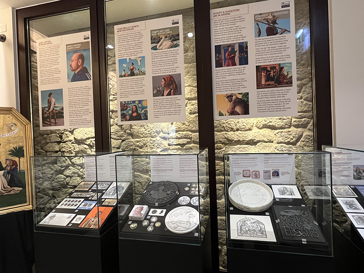 Dai modelli alla coniazione Monete per il Vaticano e un “medaglia” speciale: modello in plastilina del rovescio della moneta da 5 euro celebrativa della nascita di don Lorenzo Milani, Divisionale 2023 con moneta da 5 euro don Lorenzo Milani e studi per il rovescio dello stesso conio commemorativo, 5 euro proof in ricordo del 5° centenario della morte di Leone X, frammenti di modello in plastilina raffiguranti il Seminatore e stella dell’Ordine dei Gesuiti; monete da 20 euro in argento proof Tutela e salvaguardia del Creato (2019), moneta da 10 euro in argento proof dedicata a san Giacomo Maggiore (2023) e moneta da 5 euro in argento proof con applicazioni in oro Giornata mondiale del Migrante e del Rifugiato (2020), modello in gesso della medaglia 2018 per la rivista Wired; Il Natale e l’Anno Santo Colori e suggestioni d’arte in moneta: controstampo in silicone del modello di rovescio della moneta vaticana 10 euro in argento proof dedicata all’appostolo San Giacomo Maggiore (2023), studio di Natività per la monta in argento proof con colori, disegno definitivo per la moneta da 25 euro in argento proof Natale 2014, e modello del diritto della stessa moneta; Un viaggio Oltrematica francobolli di Natale per la Royal Mail: