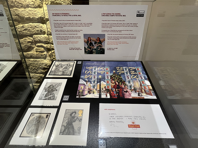 studi per francobolli Natale di Gran Bretagna (2007), foglio di 20 francobolli biglietto autografo del team della Royal Mail scambiato con l’artista durante la creazione dei medesimi francobolli e cartolina Natale 2007 celebrante i tre secoli della nascita del canto natalizio ”Hark! The Herlad Angles Sing”. Quest’ultimo sezione della personale di Marco Ventura è stata quella, assicura Roberto Ganganelli, che nel periodo delle festività, con San Marino affollata dai turisti per il cartellone di eventi “Natale delle meraviglie”, ha interessato il maggior numero di visitatori. Apprezzate anche le restanti sezioni che documentano le molteplici creazioni di Marco Ventura e ne sottolineano il suo stile artistico che attinge e reinterpreta dall’arte rinascimentale venato da realismo personale e venature oniriche. "Cerco di rappresentare - ha confessato l’artista alla RTV del Titano - i soggetti a seconda delle varie esigenze, in maniera anche differente e magari non convenzionale”. Un esempio, tra i tanti? Il dentello di Buon Natale del 2012 realizzato per San Marino, presente nella personale, che raffigura la Madonna col Bambino, rappresentata attraverso “una ragazza dei giorni nostri, mentre i due angeli che stanno alle spalle indossano giacca e cravatta, che mi sembrava comunque un'idea interessante e non convenzionale". Visitare la personale di Marco Ventura permette altresì di godere un Museo del francobollo e della moneta davvero stimolante (col biglietto in vendita a 11 euro si possono visitare le restanti istituzioni museali della più antica Repubblica del mondo), aiutati da una autoguida gratuita dell’esposizione, disponibile da fine gennaio. Inquadrando un QR con lo smartphone sarà infatti possibile ascoltare un commento di circa 5 minuti che li condurrà lungo il percorso. Danilo Bogoni