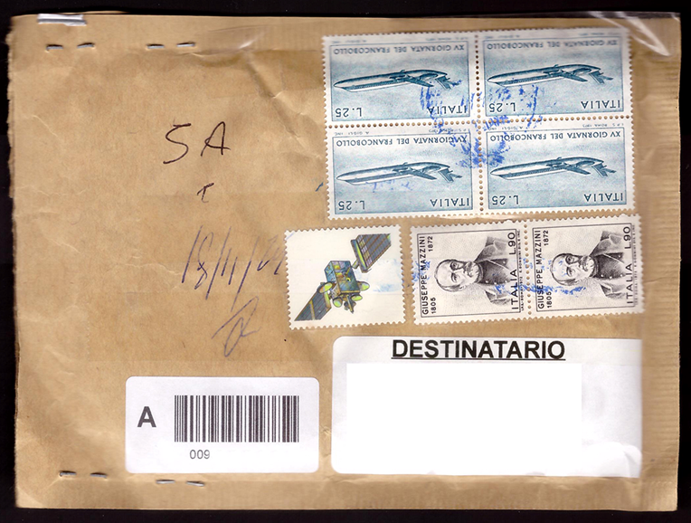 Spedire una assicurata con Poste Italiane comporta una certa spesa, commisurata sia al peso del plico sia al valore che dovrebbe essere dichiarato anche sulla busta (almeno, una volta si faceva così). Dunque: fino a 20 grammi di peso e a 50 euro di valore dichiarato, 6,65 euro di tariffa (fino a 50 grammi, euro 8,30); quando il valore dichiarato è superiore le tariffe salgono: 9,25 o 10,40 euro se il valore del contenuto arriva fino ai 250 euro e se il peso va da 20 a 50 grammi. Insomma, una bella cifretta sulla quale, qualcuno, ha pensato bene di risparmiare con la compiacente collaborazione dell’addetto postale di sportello. È il caso dell’assicurata che abbiamo il piacere di proporre questa volta, segnalatami da un amico: niente valore dichiarato sulla busta e peso incerto, diciamo entro i 20 grammi per essere generosi; tariffa prevista 6,65 euro, affrancatura applicata, la vedete tutti? Sei francobolli nelle vecchie lirette per un totale, udite udite, di 190 lire e, in aggiunta (ad abundantiam) una etichetta spaziale senza valore alcuno, edizione 1983, per un importo in euro pari a 0,95 centesimi più o meno. Quando si dice un bel risparmio! Il solerte impiegato postale si è ben guardato da apporre un timbro datario riconoscibile (qualche macchietta blu qui e là) che per altro sarebbe stato inutile visto che sui francobolli il mittente ha steso un bel velo di nastro adesivo sul quale difficilmente l’inchiostro del bollo avrebbe fatto presa. Che dire? Poste Italiane riceve dallo Stato una cifra tot per il servizio universale e il Ministero dovrebbe recuperarne una parte (piccola, per carità) con la vendita dei francobolli ma se le tariffe sono un optional e i francobolli vengono utilizzati a capocchia, alla fine paga sempre Pantalone cioè lo Stato e quindi noi, per un servizio che avrebbe dovuto pagare il mittente e che l’impiegato postale aveva il dovere di controllare. Rebus sic stantibus