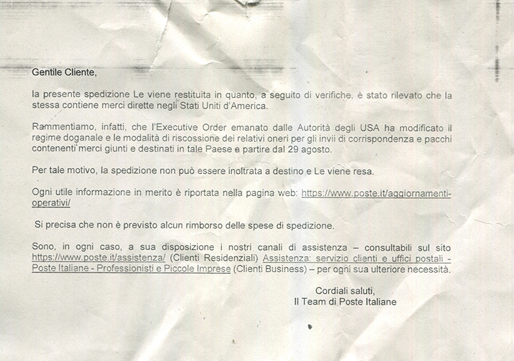 A seguito dell’Executive Order emanato il 29 agosto 2025 dalle autorità degli Stati Uniti d’America sono state modificate le norme doganali con i relativi oneri per l’invio di corrispondenza e pacchi verso tale paese. Poste Italiane ha sospeso l’invio di qualsiasi tipo di pacco lasciando attivo solo il servizio di corrispondenza: risulta quindi sospeso l’invio di qualsiasi tipo di “merce” ma non quello di “documenti”, come risulta dagli aggiornamenti operativi presenti sul sito di Poste Italiane. Fino all’emanazione dell’atto, esisteva per le merci il regime “de minimis” che applicava l’esenzione di tassa per le merci di valore inferiore agli 800 $, ma ora tale regime risulta abolito. Cosa significhi “merce” (in inglese “goods”) o “documenti” è qualcosa che risulta piuttosto aleatorio e soggetto al sentimento dell’operatore postale (dello sportello o del centro di smistamento). È piuttosto evidente che una pentola, un orologio o un paio di occhiali possano rientrare nella prima categoria ma una fotografia? Una cartolina? Una busta di storia postale? Certo tutto quello che è stato esitato attraverso una vendita (on line o meno) può essere considerato una merce ma risulta piuttosto difficile da appurare se non vi sono documenti che comprovano tale vendita. Ad esempio, se io spedisco a mio cugino John Smith che abita a Los Angeles n. 10 fotografie che ritraggono il nostro comune bisnonno nel 1901, queste sono soggette alla definizione di “merce” o di “documenti”? Oppure se voglio regalare al mio amico Frank Cook di New York, appassionato filatelico, i francobolli che ho ricevuto nella mia ultima corrispondenza, in quale categoria essi rientrano? Recentemente, nel mese di settembre 2025, quindi immediatamente dopo l’emanazione dell’Executive Order, ho spedito alcune raccomandate ed alcune Postamail Internazionale verso gli USA. Dopo circa una settimana due di esse mi sono ritornate indietro a distanza di un giorno una dall’altra, con allegata una lettera che ne spiegava il motivo: risulta che il contenuto è merce non ammessa e addirittura illegale. Tutte le altre buste che ho spedito non sono tornate indietro, almeno per ora. Le due buste contengono ognuna una decina di cartoline che, pur avendole io spedite come “documenti”, evidentemente sono state ritenute “merce” al centro di smistamento, probabilmente per lo spessore delle buste più alto, e quindi mi sono state restituite. Va anche detto che le due buste sono perfettamente sigillate come le ho spedite e non sono state aperte da nessuno, confermando che la distinzione tra “merce” e “documenti” è una scelta arbitraria dell’operatore postale. Inoltre, come espresso nella lettera allegata, non è previsto alcun rimborso delle spese di spedizione. Ho chiesto lumi all’ufficio postale ma (ovviamente mi verrebbe da dire) brancolano nel buio. L’amaro in bocca per fortuna mi rimane addolcito dal fatto che posso aggiungere due pezzi piuttosto singolari alla mia collezione di storia postale. Questa la pagina del sito di poste relativa all’oggetto Samuel Rimoldi | ||||||||||||||