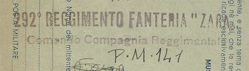 Corrispondenze di militare del Btg. Bersaglieri Zara che utilizza PM 141. Dopo l'8/9/43 rimane sotto mentite spoglie in città e utilizza la posta civile, secondo il suo "nuovo" status.