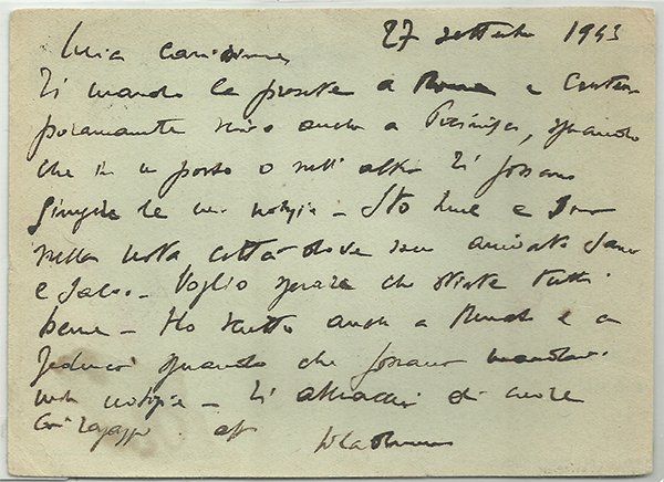 Nel testo: "Sto bene e sono nella nota città dove son arrivato sano e salvo." Le truppe della 158ª Divisione dopo l'armistizio si concentrarono rientrando nella loro piazzaforte in città. |