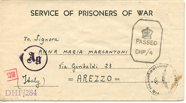 Lettera spedita dal Capitano Giacinto Marcantoni dal Campo n. 24, il 16.12.1943 ad Arezzo. Censura britannica e tedesca. Marcantoni scrive alla moglie, nel contenuto riferisce che è il suo secondo Natale di prigionia, ma lui si sente sempre vicino a lei ed ai suoi cari. Successivamente nel 1945, risulta trasferito nel campo 10 di Bhopal.