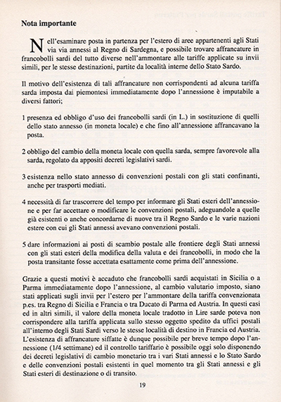 Il socio ed amico Giovanni Riggi di Numana ha voluto rispondere al mio appello per ricordare con uno studio inedito il trentennale della nascita dell’Associazione Italiana di Storia Postale mettendo a disposizione questa sua approfondita ricerca sulle tariffe postali del regno di Sardegna. Sono lieto di aver ottenuto dal Presidente dell’Unione Filatelica Lombarda, Giorgio Khouzam, l’immediata piena adesione alla realizzazione del progetto, nello spirito di collaborazione che anima ormai da anni i due sodalizi. Poco più di trent’anni fa in Italia il termine “storia postale” era solamente la traduzione letterale di “postal history” inglese: definizione nata dalla fantasia di quel grande esperto e nostro Socio Onorario Robson Lowe, che purtroppo ci ha recentemente lasciati. Fu la nascita della nostra Associazione ad indicare, nel nostro Paese, il cammino da percorrere e ciò dura ancora in questi giorni. Oggi possiamo constatare con orgoglio come la “Storia Postale” sia divenuta in Italia una disciplina che vanta studiosi di alto livello e, forse, più collezionisti di qualsiasi altra specializzazione filatelica. Siamo orgogliosi del fatto che quasi tutti i grandi nomi della storia postale italiana siano passati attraverso le fila dei nostri Soci. Non credo che, senza l’appassionato interscambio di esperienze vissute da questi amici dell’A.I.S.P., lo sviluppo e la diffusione della “Storia Postale” sarebbe stato altrettanto rapido e proficuo. Sono quindi onorato, quale attuale Presidente, di veder realizzato questo progetto che avevo profondamente desiderato per ricordare, comunque, un altro momento del basilare apporto dell’A.I.S.P. nei confronti dei collezionisti e degli studiosi. A tutti gli amici che si sono impegnati in questa realizzazione, il mio più sentito ringraziamento.