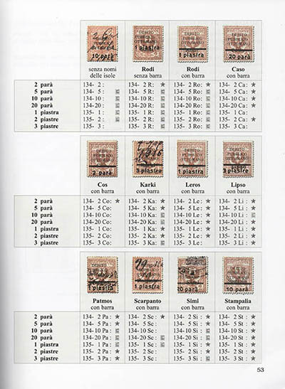 Ringraziamenti; indici; prefazione; sintesi storica; Parte prima – periodo Ottomano: la carta bollata, le marche da bollo, il Debito Pubblico Ottomano, l’amministrazione del D.P.O. nel Dodecaneso, usi speciali delle marche da bollo; Seconda parte – Occupazione italiana (1912-1923): il servizio del debito Pubblico Ottomano, il personale del S.D.P., tasse e diritti del D.P.O., la carta bollata, le marche da bollo del D.P.O. nel Dodecaneso (1912-1923); Terza parte – possedimento italiano (1923-1943): marche da bollo dell’Italia metropolitana, nuove soprastampe di marche da bollo italiane, francobolli usati fiscalmente, marche da bollo usate per posta, i bolli per le tasse sugli scambi, la carta bollata, foglietti bollati per licenza di porto d’armi, la carta bollata dei titoli delle Society Anonime, fascette private per vendita di tabacchi, le cambiali; Quarta parte – le marche municipali: le marche municipali di Rodi, marche municipali di Castelrosso, marche municipali di Coo, marche municipali di Lero, marche municipali di Porto Lago; Quinta parte – dopo l’8 settembre 1943: periodo italo tedesco 13.9.43 - 9.5.45, l’occupazione militare inglese 9.5.45 - 31.3.47; Sesta parte – l’amministrazione ellenica: l’amministrazione militare ellenica 1.4.47 - 15.5.48, l’amministrazione generale del Dodecaneso; fonti bibliografiche; allegati.