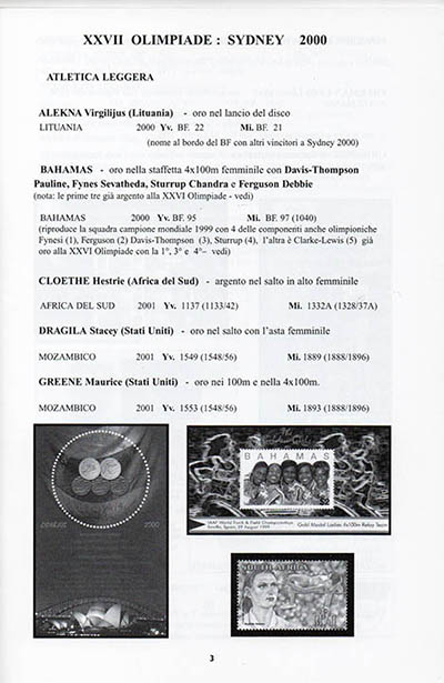 Questo è il quinto volume su “I vincitori di Medaglie olimpiche” dei Giochi Estivi, che fa seguito al Vol. I sui Giochi dal 1896 al 1988, al Vol. II sui Giochi di Barcellona 1992, al Vol. III sui Giochi di Atlanta del 1996 e al Vo. IV aggiornamento ai Giochi 1896/1988. E’ doveroso ricordare sempre che la catalogazione comprende il materiale filatelico-postale emesso dalle varie Amministrazioni Postali, compresi i Paesi posti all’indice dalla FIP e quelli considerati in genere poco seri filatelicamente. Sono riportati anche gli Interi Postali con sovrastampe private, che hanno pur sempre una loro validità postale. L’intento è quello di dare una maggiore completezza di notizie, è compito poi del collezionista scegliere cosa raccogliere e, per chi intende esporre a concorso, cosa inserire nella sua collezione.