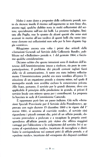 I Comm.ri Giuseppe Gaggero e Renato Mondolfo che per primi proposero all’attenzione dei collezionisti di storia postale le collettorie e ai quali va il dovuto merito, trattando la materia in forma generale e relativamente a tutto il territorio nazionale, lasciarono ovviamente delle zone d’ombra. La curiosità, ossia il naturale desiderio di saperne di più intorno ad un aspetto del contesto storico postale, ha spinto molti collezionisti a rivedere le proprie raccolte, riconsiderando l’uso nel tempo e nello spazio di ciascun elemento od oggetto postale. Ricerche più approfondite da parte di alcuni studiosi hanno successivamente chiarito taluni aspetti lacunosi e fugato qualche dubbio, contribuendo a completare il mosaico molto interessante sui metodi e sugli sviluppi del servizio postale dell’epoca. Ciononostante riteniamo che molto ci sia ancora da chiarire, soprattutto nell’ambito di ciascuna regione, dove situazioni d’ambiente e prassi locali hanno dato luogo a casi curiosi e difformi. Nella convinzione di contribuire a migliorare la conoscenza e il funzionamento del servizio, abbiamo ritenuto di riprodurre, per commi capi, la storia delle collettorie pugliesi con l’indicazione degli uffici postali cui erano aggregate e, ove è stato possibile, il mezzo di collegamento. A questo modo riteniamo sarà più facile la lettura delle corrispondenze che presentano due o più bolli o annulli.