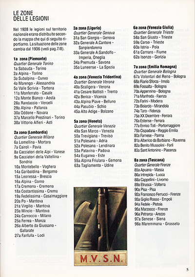 Nota dell’editore; importanti avvertenze; codice di abbreviazioni; introduzione; date storiche; le zone delle legioni; la nuova organizzazione della MVSN dopo il 1936; le legioni; Moschettieri del duce; Milizia Artiglieria Contraerea; Milizia Artiglieria Marittima; Milizia di Frontiera; Milizia Universitaria e Avanguardia; Milizia Ferroviaria; Milizia Forestale; Milizia Portuaria; Milizia della Strada; Ufficio Storico della Milizia; varie; Milizia Coloniale; Guerra di Spagna; II Guerra Mondiale; composizioni delle Divisioni Coloniali; bozzetti usati per più edizioni.