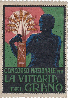 | Erinnofilo non dentellato, emesso in occasione del Concorso Nazionale per la Vittoria del grano lanciato nell’annata agricola 1925-26. (Bozzetto di Leonetto Cappiello) |