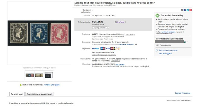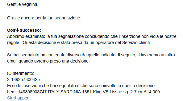 Alla "sagra del falso", che a catalogo (per chi ci crede...) varrebbe 50.000 euro, hanno partecipato ben 17 diversi offerenti, per un totale di 43 offerte. Come i miei quattro lettori ricorderanno, in passato feci a eBay INUTILMENTE oltre 9000 (novemila) segnalazioni di falsi posti in vendita. Recentemente, proprio relativamente ai falsi Fournier della Prima Emissione di Sardegna, che venivano offerti in serie completa, provai a fare l'ennesima segnalazione col nuovo sistema proposto dalla casa d'aste on-line, per vedere se era cambiato qualcosa: la segnalazione era molto dettagliata sulla tipologia della falsificazione e questa รจ la risposta che ricevetti: