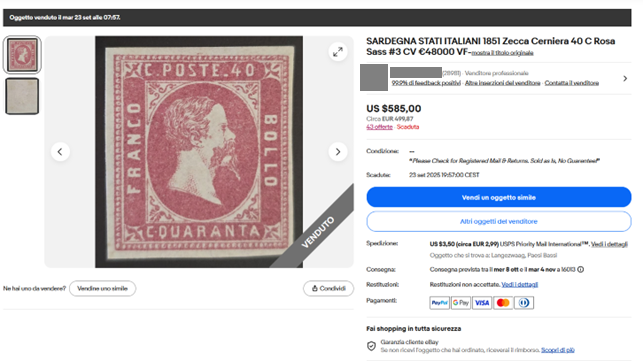 Lo spunto per queste brevi note mi viene dato dal lotto qui illustrato, venduto su eBay il 23 settembre, alle ore 7,57 per 585 dollari. Si tratta del banalissimo falso prodotto dalla ditta Fournier di Ginevra e facilmente riconoscibile dagli elementi evidenziati a suo tempo nei miei articoli sui falsi di Sardegna (https://www.ilpostalista.it/falsi/falsi025.htm)