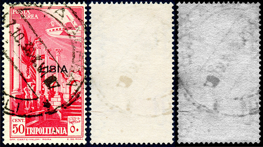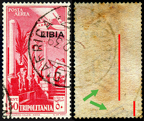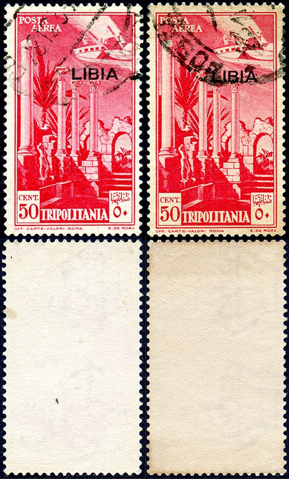 La caratteristica più evidente dei due tipi principali di carta descritti, oltre il colore, è l’orientamento delle corone che può essere destro o sinistro; tale direzione è data dalla posizione della croce sull’apice della corona. In base agli esemplari visionati, la filigrana è quasi esclusivamente destra nella carta bianca e altrettanto quasi solo sinistra in quella crema. Ho riscontrato pochissimi esemplari con l’orientamento invertito in entrambi i casi. Tra l’altro ho notato che gli esemplari su carta crema riportano principalmente l’annullo POSTA AEREA * TRIPOLI D’AFRICA * corrispondente al n. 131 della clas-sificazione di Macrelli e al n. 65 di quella di Di Vita.