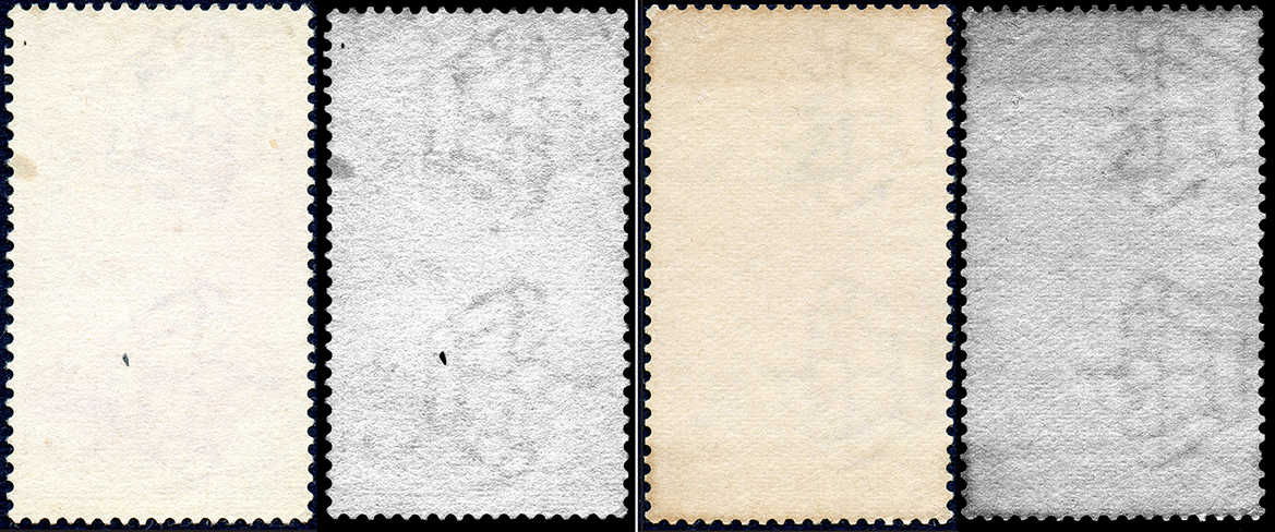 Figura 2 – Da sinistra le prime due immagini sono dello stesso francobollo su carta bianca; la coppia di destra invece riproduce l’esemplare su carta crema. Entrambi sono gli stessi di figura 1. Si noti il differente orientamento delle corone in filigrana.