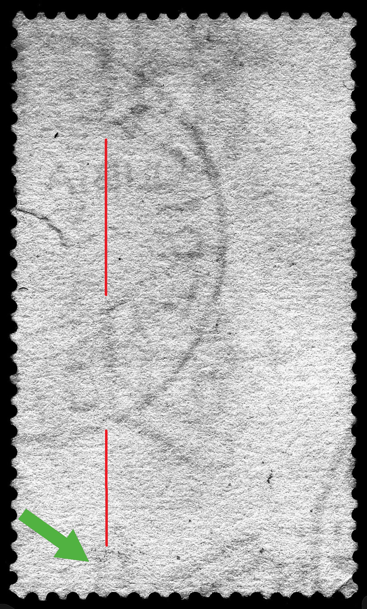 La base della corona spostata (freccia verde) sembra essere rimasta più o meno secondo l’allineamento iniziale come mostrano i due segmenti rossi. La restante parte di corona sembrerebbe spostata verso destra. C’è un altro dato che potrebbe fornire un contributo: la lunghezza dei due segmenti rossi è differente. Il graticcio di corone per costruzione dovrebbe avere la disposizione regolare con distanze orizzontali e verticali pressoché costanti. La perfezione del tappeto di corone non era certamente ideale, ma difficilmente si potevano avere variazioni di spaziatura tra le corone così evidente come in figura 6. Può succedere, non con tanta facilità, che un elemento del tappeto di corone possa spostarsi ma in questo caso penserei più probabile una interpretazione (sopra accennata) un po’ complessa che prevede lo spostamento della corona accompagnata dalla separazione tra la base e la parte soprastante in tal modo si giustificherebbe sia la distanza ridotta evidenziata dai segmenti rossi sia la maggiore distanza della parte alta della corona. Peccato che la dentellatura sia nella posizione meno opportuna e genera una certa ambiguità che non aiuta. Purtroppo non ho trovato il francobollo sottostante. Nel caso esistesse e qualche collezionista sa di averlo, sarebbe possibile sviscerare meglio questo strano fenomeno. Il secondo esemplare è invece passato per posta senza essere annullato, si tratta quindi di un nuovo senza colla (figura 7). In questo esemplare la corona in basso presenta una rottura in corrispondenza dell’attacco con la base.