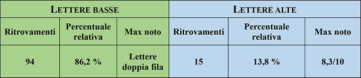 In questo paragrafo non sono considerati i due esemplari con filigrana lettere in doppia fila. Descriverò i ritrovamenti degli esemplari con filigrana lettere suddividendoli in filigrana lettere in basso e in alto (figura 11). Anticipo subito che la posizione in basso è decisamente più comune. È interessante notare il grande divario tra le due posizioni di filigrana.