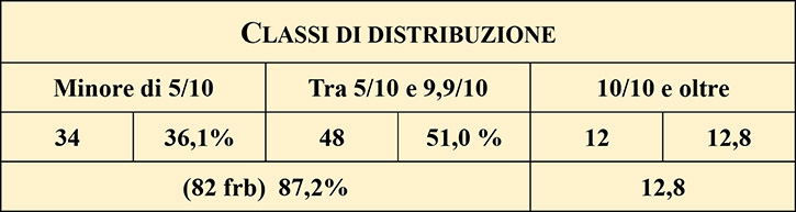 Figura 12 – distribuzione di frequenza secondo tre classi di percentuale della presenza La suddivisione presentata ha una sua razionalità dovuta più che altro all’interesse collezionistico dove gli accenni di filigrana lettere sono di regola tralasciati; il dato di maggiore interesse che si ha dalla tabella è la frequenza di lettere piene rispetto a quelle parziali. Non mi è nota, e credo non sia mai stata fatta, una distribuzione statistica generale sulla frequenza di questa tipologia di dati pertanto posso solo presentare i dati relativi al lotto analizzato e specificare che i valori numerici sono relativi esclusivamente a questo lotto senza attribuirgli un significato statistico generale. I valori esposti sono quindi presentati in percentuale relative all’interno di ciascun gruppo descritto.