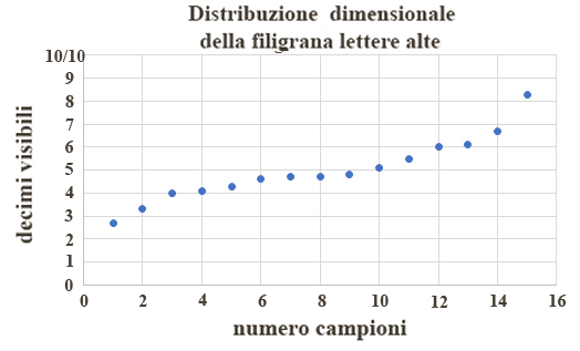 Dove invece non si formano tratti orizzontali vuol dire che ciascun francobollo ha diverso valore decimale. Un chiaro esempio sono i valori con oltre 10/10 di filigrana lettere che corrisponde alla parte di curva intorno al numero 90. Qui la curva si inclina di più proprio per la maggiore differenza dei valori decimali, in questo gruppo si notano due campioni vicini che determinano un brevissimo tratto orizzontale, si tratta due campioni con identico valore di 11,3/10. Da notare la possibilità di rinvenire qualunque decimale di lettere in filigrana e, con maggiore probabilità, quelli inferiori a 10/10, come si evince dal tratto di curva meno inclinato compreso tra le due linee orizzontali. Concludendo questa descrizione, la correlazione teorica del grafico dovrebbe essere una retta inclinata nel caso in cui per ciascun valore ci fosse un solo francobollo e la differenza tra i valori decimali sia costante.
