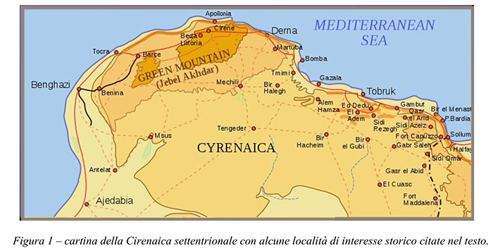 Introduzione Gli annulli con anno errato 1910 anziché 1940 sono noti solo per due località della Cirenaica: Derna e Porto Bardia. Non sono noti per la Tripolitania. In letteratura la dizione ricorrente è “data errata”, non mi sembra corretta ma è nota così ed è meglio non creare confusioni con ulteriori definizioni. Derna era Capoluogo di Provincia della Cirenaica orientale ed è situata nell’estremo orientale del Jebel Akhdar, il sistema montuoso che corrisponde al promontorio che aggetta sul mare nel nord della Cirenaica. Porto Bardia invece è in prossimità del confine con l’Egitto. Si tratta di annulli di difficile reperimento su documento postale. È stata definita “data errata” ma in realtà fu dettata da necessità. Infatti in molti uffici erano ancora presenti timbri di vecchia produzione risalenti alle fasi iniziali della conquista della Libia. In Cirenaica, in qualità di seconda regione rispetto alla Tripolitania, negli anni, il rinnovo delle attrezzature degli uffici postali ha avuto una velocità ridotta tanto che in molti uffici erano utilizzati giornalmente anche i vecchi guller di inizio conquista. In modo specifico e stando alle notizie sinora note, il rinnovo dei guller in alcune località è stato particolarmente lento tanto che in molte sono state saltate alcune produzioni e si ha accanto al vecchio guller di diametro ridotto quello di ultima generazione avente diametro di mm 32 e gli apici delle lunette arrotondati. In altre località è stata saltata l’ultima produzione e sono presenti guller relativamente più recenti. Durante la fine degli anni ’30 i venti di guerra erano già nell’aria e gli interessi amministrativi sono stati concentrati su attività di maggiore importanza. Fatto sta che l’inizio delle ostilità (10 giugno 1940) ha di fatto bloccato tutte le buone intenzioni per modernizzare le attrezzature postali della colonia. Nella cartina di figura 1 è rappresentata la parte settentrionale della Cirenaica durante gli anni ’30-‘40 nella quale sono riportate le località di interesse per questo articolo.