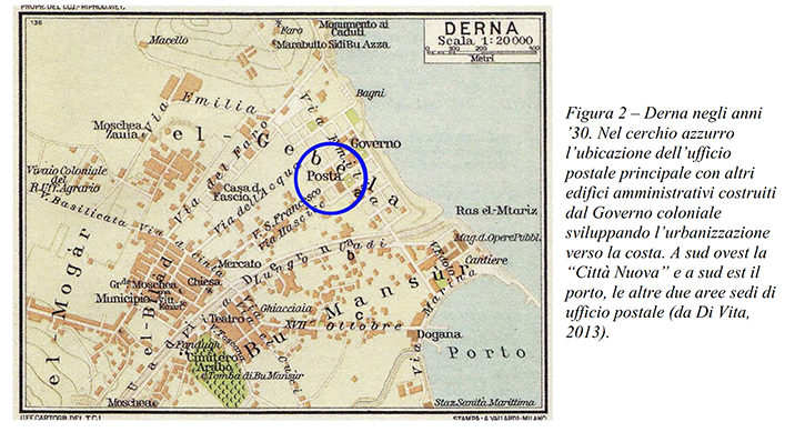 La data errata è dovuta al fatto che alcuni uffici postali avevano in dotazione vecchi guller nei quali la rotellina della prima cifra relativa agli anni aveva soltanto tre numeri: 1, 2 e 3; si potevano quindi usare fino al massimo al dicembre del 1939 (l’anno a quattro cifre era presente solo in alcune tipologie di guller). Il mancato arrivo dei nuovi timbri avrebbe messo in evidenza la necessità di richiedere alla sede centrale delle Poste quale avrebbe dovuto essere la soluzione corretta per continuare ad annullare gli invii postali. Sembrerebbe che la risposta ufficiale sia stata quella di utilizzare la cifra 1 al posto del 4; il condizionale è d’obbligo in quanto non ho mai avuto modo di vedere documenti ufficiali in merito. Stando alle notizie fino ad ora note, tra tutte le località della Cirenaica sono risultate solo due quelle che si sono trovate di fronte a questa necessità e, come accennato, furono Derna e Porto Bardia. Per questa seconda località si può capire come il suo totale decentramento all’estremo est della Cirenaica l’abbia costretta ad avere contatti radi con l’Amministrazione Centrale; meno decentrata era certamente Derna, non solo in termini spaziali, ma anche in termini di collegamento con gli uffici centrali essendo Capoluogo di Provincia. Inoltre Derna aveva un parco timbri consistente che fu aggiornato ripetutamente, come dimostrano le impronte note dei guller, aveva anche quelli di ultima generazione (diametro mm. 32). A Derna erano presenti ben due sportelli vaglia (Vaglia A e B), uno sportello telegrafico e, probabilmente più di uno sportello per la corrispondenza e i pacchi e forse anche altri, per un totale di impronte note pari a 22 guller, di queste cinque avevano il datario aggiornato, stando a quanto finora noto. La sede di questo ufficio postale era in un’ala dell’edificio del Tribunale che a sua volta era nei pressi del Palazzo del Governo, in prossimità della costa (figura 2).