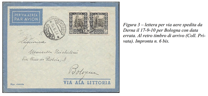 Un altro Ufficio Postale era nel centro cittadino (Derna Centro) in corrispondenza della parte urbana nota come “Città Nuova”, più ampia e ubicata più all’interno; questo ufficio, da quanto noto, aveva tre guller. Un ulteriore ufficio postale era ubicato in zona porto per svolgere una attività più indirizzata ai pacchi, dizione riportata anche nei due guller in dotazione. In totale quindi i guller in uso a Derna erano parecchi e tra questi anche quelli più moderni quindi non è facilmente spiegabile l’uso dei vecchi guller, a meno di un qualche incidente che ne potrebbe aver reso alcuni inutilizzabili oppure che ci sia stato un interesse strettamente filatelico, non è affatto da escludere a priori. Fatto sta che due di questi timbri sono stati utilizzati con l’anno 10 (1910) anziché 40. Al contrario, Porto Bardia aveva in dotazione solo cinque guller, quattro di produzione non recente ed uno di ultima generazione. In questo caso si può ritenere plausibile che un solo guller non riuscisse a soddisfare le necessità dell’ufficio e quindi altrettanto plausibile l’utilizzo dei vecchi con la data errata. La nota stonata è che dei quattro guller più vecchi, ben tre sono noti con la data 10, ma ritengo che si possa plausibilmente pensare che siano stati predisposti preventivamente per snellire le operazioni di timbratura. Nel grande lotto di francobolli analizzati ho trovato pochi esemplari con data errata e ciò è già indicativo della loro difficoltà di reperimento. Di certo Derna è la meno problematica e invii postali con data errata non sono rari (figura 3).