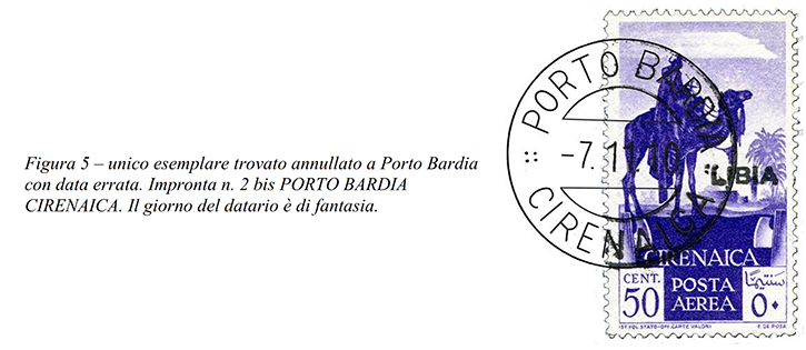 Il guller DERNA CORRISPONDENZE con data corretta è stato quello più usato in assoluto per questa località e spesso è molto inchiostrato. Con data errata invece le valutazioni si invertono con 11 punti DERNA CORRISPONDENZE e 10 punti DERNA CIRENAICA. Come si può notare dalla figura 4, l’annullo non è facilmente leggibile, tipico in questo periodo per questo guller, evidentemente molto usato ma poco curato dagli addetti. L’impronta è stata ricostruita da esemplari con annullo nitido che sono veramente pochi. Anche per Porto Bardia ho trovato un solo esemplare (figura 5) che riporta l’impronta n. 2 bis valutata punti 12. I tre annullatori noti con data errata di questa località sono quasi sempre inchiostrati e di non facile confronto con le immagini riportate nei testi specifici, bisogna sempre fare attenzione ai particolari che consentono di riconoscere il tipo.