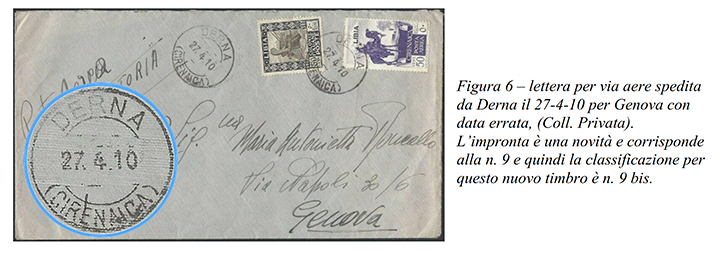 Fin qui non ho trattato novità e non è da me, non scrivo articoli compilativi trattando argomenti già noti. Anche in questo caso, quindi, ho alcune novità da proporre ai miei lettori. La prima novità è un nuovo annullo DERNA (CIRENAICA) con data errata, ma questa volta è con le parentesi che racchiudono il nome della Regione e senza le stellette ai lati del datario. Si tratta di un invio postale per via aerea del 27.4.10 (40) per Genova (figura 6).