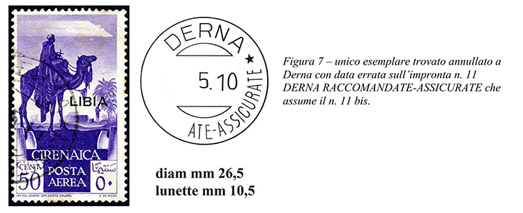 Nel particolare ingrandito dell’annullo si possono notare i caratteri distintivi accennati. Un altro particolare interessante sono le lunette, ponendo orizzontale il datario, divergono tra loro verso sinistra per un angolo di circa 3° tanto che la loro distanza è mm. 11,5 a sinistra e 10,5 a destra; conseguentemente la parentesi sinistra sborda appena sull’apice della lunetta pur essendo in linea con la parentesi di destra. L’unica impronta con questi caratteri è la n. 9 ed in questo caso, con la data errata va inserita come nuova impronta classificandola col n. 9 bis. Si noti come l’annullo colpisca poco i due francobolli e l’intera data è sulla busta; situazione in cui sugli esemplari sciolti questa informazione sarebbe stata persa. La seconda novità è un altro esemplare usato a Derna con data errata con l’impronta n. 11 DERNA RACCOMANDATE-ASSICURATE con due stellette e senza le parentesi alla quale ho attribuito il n. 11 bis (figura 7).