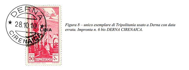 Purtroppo, le impronte riportate in letteratura sono deformate in modo eccessivo, tanto che nemmeno rettificando le immagini con adeguati software è possibile riportarle alla geometria circolare senza alterare forma e posizione delle singole lettere. È quanto ho potuto constatare durante l’operazione di rettifica. Non potendo operare una ricostruzione indiretta, mi sono affidato alle impronte con data corretta presenti nel lotto. Purtroppo ho recuperato solo sei impronte DERNA RACCOMANDATE-ASSICURATE, tutte con la parte destra dell’annullo. Alla fine del lavoro ho potuto ricostruire all’incirca i due terzi dell’impronta che comunque è attribuibile e conserva il suo valore storico con la data parziale 5.10 in evidenza. L’assenza del giorno di spedizione è una pecca relativa e la data va comunque a sommarsi alle date note che sono diluite nell’anno sin dal mese di gennaio. C’è una ulteriore novità per Derna e questa penso sia proprio un pezzo unico, difficilmente se ne potrà trovare un secondo esemplare. Si tratta dell’uso in Cirenaica del corrispondente valore rosso da cent. 50 emesso per la Tripolitania con soprastampa LIBIA e con annullatore l’impronta n. 6 bis (figura 8).