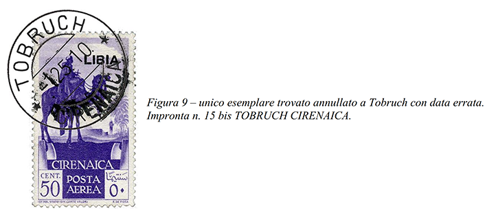 L’uso dei due valori, rosso e viola, nella regione non di pertinenza non è assolutamente una rarità ed è stata oggetto anche di interesse da parte di collezionisti e commercianti. Ma non tutti gli usi fuori regione sono stati procurati, ce ne sono molti naturali e dovuti al fatto che molte persone, anche militari, che si spostavano sul territorio portavano sempre con sé qualche francobollo per avere la certezza di poter inoltrare invii senza problemi e con risparmio di tempo. In questo caso l’annullo corrisponde all’impronta già nota DERNA CIRENAICA con data errata classificata con il n. 6 bis. Se questo invio fosse stato filatelico, sarebbe sicuramente giunto sino a noi sulla sua bella busta ben conservata. A questo punto riprendo l’esemplare di Tobruch che ho presentato nel mio primo articolo sugli annulli di Libia (Cipriani, 2025) (figura 9). Ricordo che Tobruch annullato con data errata non era assolutamente noto fino alla mia pubblicazione e per questo motivo è ben degno di essere ripreso ed inserito in questo articolo dedicato alle novità delle date errate.