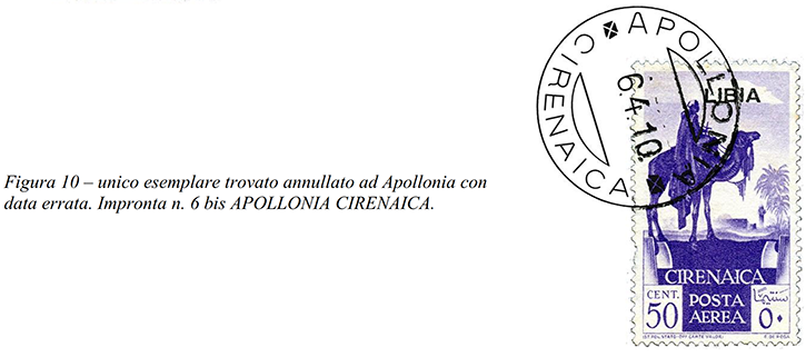 L’unica impronta possibile tra le numerose conosciute per Tobruch è la n. 15 alla quale ho aggiunto il termine “bis”. A parte le due gambine della R, in questo caso manca ogni accenno al nome della città e sul francobollo è leggibile solo quello della Regione. Rimando all’articolo di riferimento per chi volesse approfondire le modalità di attribuzione a questa località. L’ultima novità è l’uso di due annulli con data errata in località Apollonia. Questa località è stata una antica colonia greca, divenuta romana dal I secolo a.c., i cui resti si trovano in prossimità di Marsa Susa, con l’occupazione italiana si è voluto tornare alla denominazione romana. Nell’antichità era il porto di Cirene dalla quale dista circa 18 chilometri. In figura 10 riporto il ritrovamento di data errata su un francobollo sciolto con la ricostruzione completa del timbro. Sul francobollo è leggibile la data completa: il 6 aprile del 1910 (40).