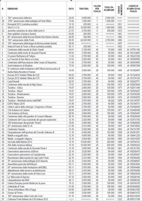 Nel 2012 sono stati ufficialmente stampati 196.313.000 francobolli e 1.000.000 tra cartoline e buste postali oltre, ovviamente, le ristampe dei valori ordinari “Poste italiane” da 0,60 € e le buste del secolo e mezzo delle stesse poste considerate, chissà perché, anch’esse ordinarie. Con una media di circa 35 valori per foglio, ed escludendo tutti gli interi e i foglietti o simili, privi del codice di stampa, sono stati impressi commemorativi per 4.239.222 fogli. Secondo il numeratore JA e tenendo conto dei due valori estremi di cui si è presa visione, i fogli sarebbero dovuti essere 6.622.489 e comunque circa 6 milioni e settecentomila, con una differenza inspiegabile, pur tenendo conto dei fogli scartati dalla lavorazione perché difettosi. Ciò, ricordando che i 60 cent “Poste italiane” del 2012 hanno la serie JB e che alla stessa serie appartengono circa 1.400.000 numeri di valori commemorativi (i fogli avrebbero dovuto essere 350.000), ci porta a due considerazioni – domande: o i numeratori sono “manovrabili”, o esistono molti fogli di valori orinari di entrambe le serie, JA e JB, che non sono stati distribuiti. È difficile fare una terza ipotesi, dal momento che il Poligrafico non stampa altri valori bollati per l’Italia, una volta eliminato il settore fiscale, a meno che quei numeri non facciano parte di francobolli stampati per stati terzi (Vaticano, San Marino, SMOM o altro). La stessa serie JB è difficilmente spiegabile a meno che non si pensi ad un altro numeratore appartenente ad un’altra rotativa o comunque ad una numerazione indipendente. In ogni caso sono circa 3.500.000 i fogli stampati con entrambe le serie che non fanno parte di quelli attribuiti ai valori commemorativi del 2012.