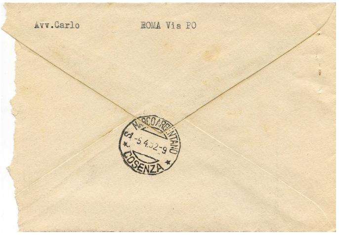 Raccomandata AR arrivata a San Marco Argentano il giorno 5.4.1952 (verso)
