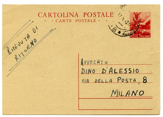Gli interi vengono utilizzati con valore uguale o inferiore a quello della tariffa dell’avviso di ricevimento: nel caso di valore inferiore l’importo della tariffa è raggiunto con un’affrancatura complementare. E’ difficile reperire dal 1945 al 1951, usi di cartoline postali senza affrancatura complementare (il cui valore corrisponde a quello della tariffa A.R.) perché la tariffa dell’avviso di ricevimento rimane sempre superiore a quello della cartolina; successivamente, con l’aumento tariffario del 1.8.1951 la tariffa della cartolina postale viene aumentata a 20 lire mentre la tariffa dell’avviso di ricevimento rimane invariata, a 20 lire; le due tariffe rimangono identiche fino al 1982. La cartolina Democratica da 10 lire (Fig.4), emessa per coprire la tariffa estero, dal 1.4.1947 al 25.3.1948, è utilizzata in perfetta tariffa a.r. il 17 maggio1948 da Milano (tariffa di 10 lire dal 1.8.47 al 10.8.48. Questo è una delle poche cartoline postali che è possibile utilizzare in tariffa a.r. senza integrazione di francobolli. La cartolina Democratica da 20 emessa nel 1948 risulta peraltro distribuita, in modo regolare, solo dalla fine del 1951.