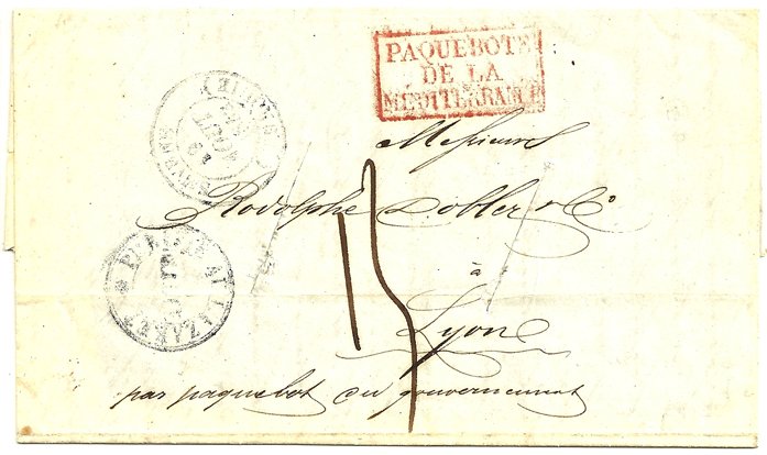| Documento 1 – Lettera scritta il 17 agosto 1842 a Costantinopoli ed impostata presso l’ufficio francese del porto ottomano di Smirne. Transito via il lazzaretto di Malta e arrivo a Marsiglia il 1° settembre col piroscafo MINOS. A quell’epoca la compagnia privata delle Messageries impériales non esiste : il mittente ha dunque indicato in basso la soprascritta ‘par paquebot du gouvernement’, cioè “col vapore dello Stato francese”. |