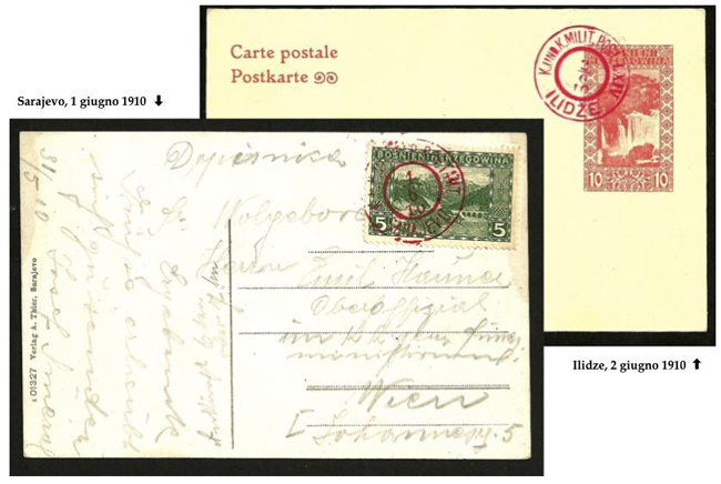 … ma narrare un fatto politico poco conosciuto ai più nel momento in cui stiamo commemorando in Europa lo scoppio della prima Guerra mondiale : questo episodio è evocato da queste due cartoline: la prima viaggiata da Sarajevo per Vienna, la seconda raccolta da un collezionista dell’epoca per conservare un esemplare dell’annullo commemorativo della visita dell’Imperatore Franz-Joseph in Bosnia-Erzegovina dal 30 maggio al 4 giugno 1910. Per celebrare l’evento gli uffici principali del territorio bosniaco utilizzarono per i loro bolli annullatori l'inchiostro rosso.