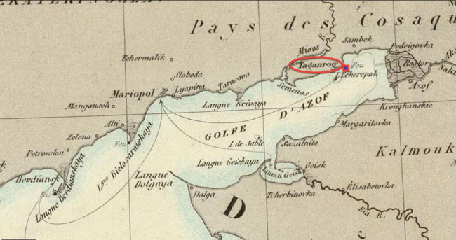 Da Taganrog a Malta Un occhio attento avrà notato che la soprascritta della nostra lettera reca, in alto a sinistra, il timbro del mittente: Agostino Amoretti, negoziante italiano residente a Taganrog (fig.5), porto russo del Golfo d’Azov (fig.6):