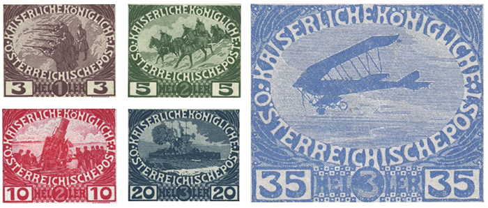 La terza opzione è quella interpretata dall’emissione decisa a Vienna. RAFFIGURARE LA GUERRA Dopo il successo della prima emissione del 1914, con 30 milioni di francobolli venduti, l’amministrazione postale sollecitò ancora una volta l’artista Koloman Moser, ormai ben conosciuto dai nostri lettori. Per il Ministero e la Staatsdruckerei (Stamperia di Stato di Vienna), questo nuovo progetto si doveva diversificare dal precedente: invece del solito viso del monarca, o dell’aquila asburgica, l’artista doveva rappresentare le principali armi dell’esercito: fanteria, cavalleria, artiglieria, flotta da guerra ed aviazione.