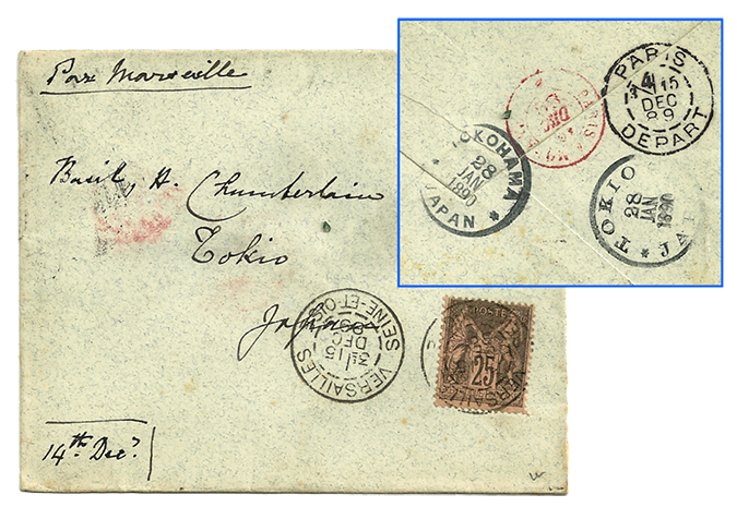In arrivo a Yokohama (fig.5) il 21 aprile, dopo 6 settimane di navigazione, l’indirizzo viene trascritto in lettere giapponesi, a tergo della busta, perché possa proseguire fino alla sua destinazione finale e raggiungere il professore Chamberlain.