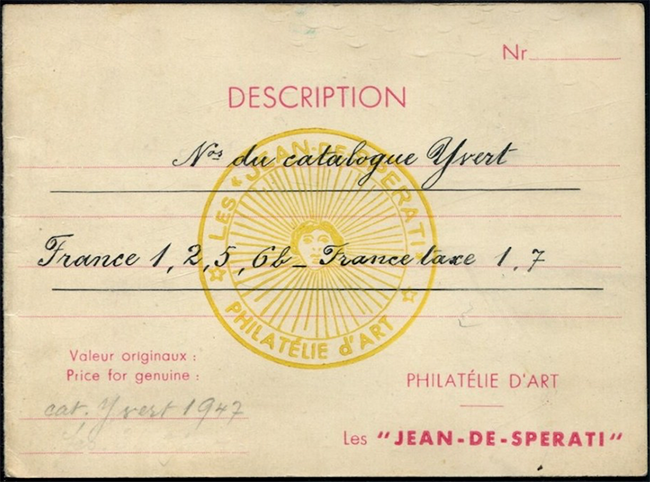 Sperati chiamava la sua attività “Philatélie d’Art”, cioè Filatelia d’Arte: egli attribuiva a se stesso non la fabbricazione di falsi, ma la “riproduzioni” di francobolli di ottima qualità… ponendoli in vendita sul mercato al 1% del valore dell’originale, prezzo che già nella sua cifra esprimeva la mancata intenzione di sfruttare un eventuale sprovveduto cliente. vediamo, sotto, un esempio di presentazione delle sue figurine (fig. 4, asta Alliance Philatélie): erano presentate in un cartoncino ripiegato in due. A sinistra, un’intestazione “Jean De Sperati / Aix-les-Bains / Savoie” accompagnata dalla sua firma…