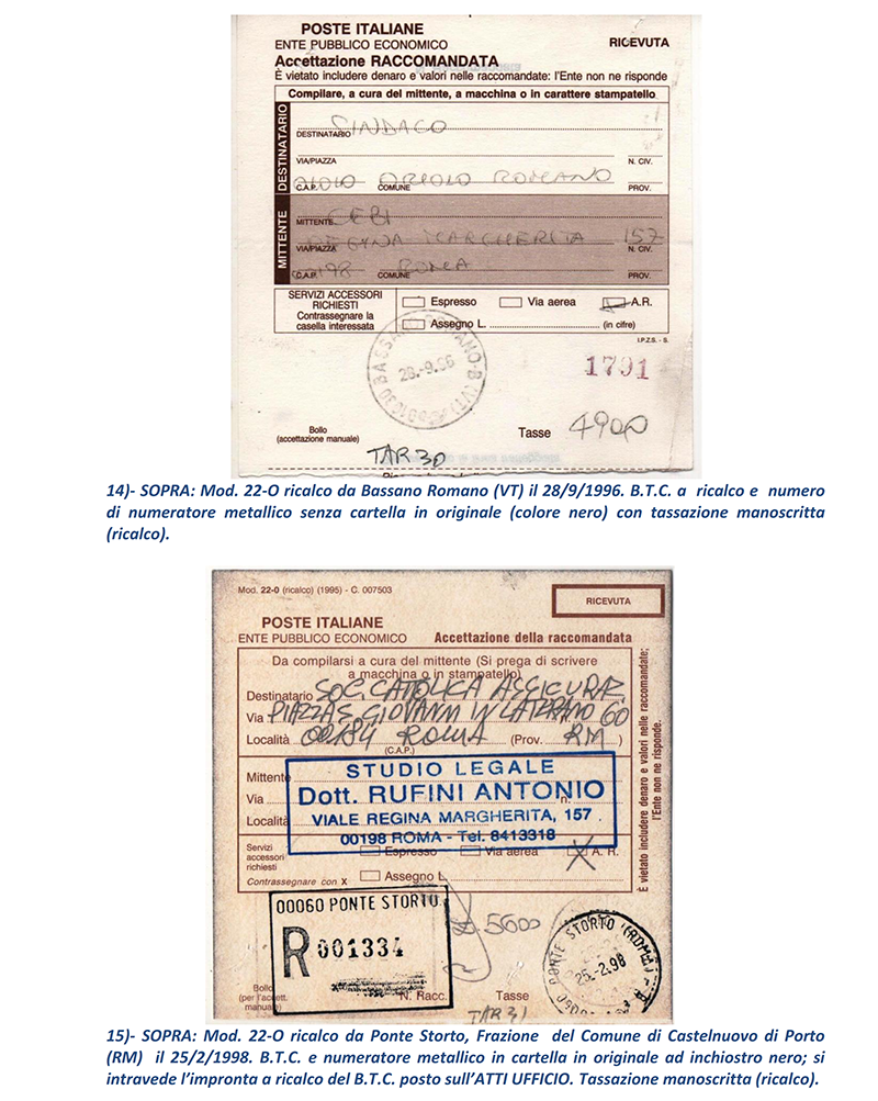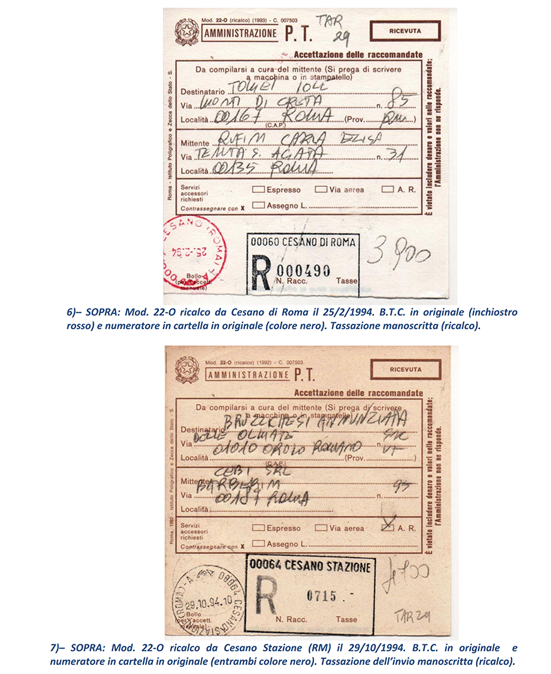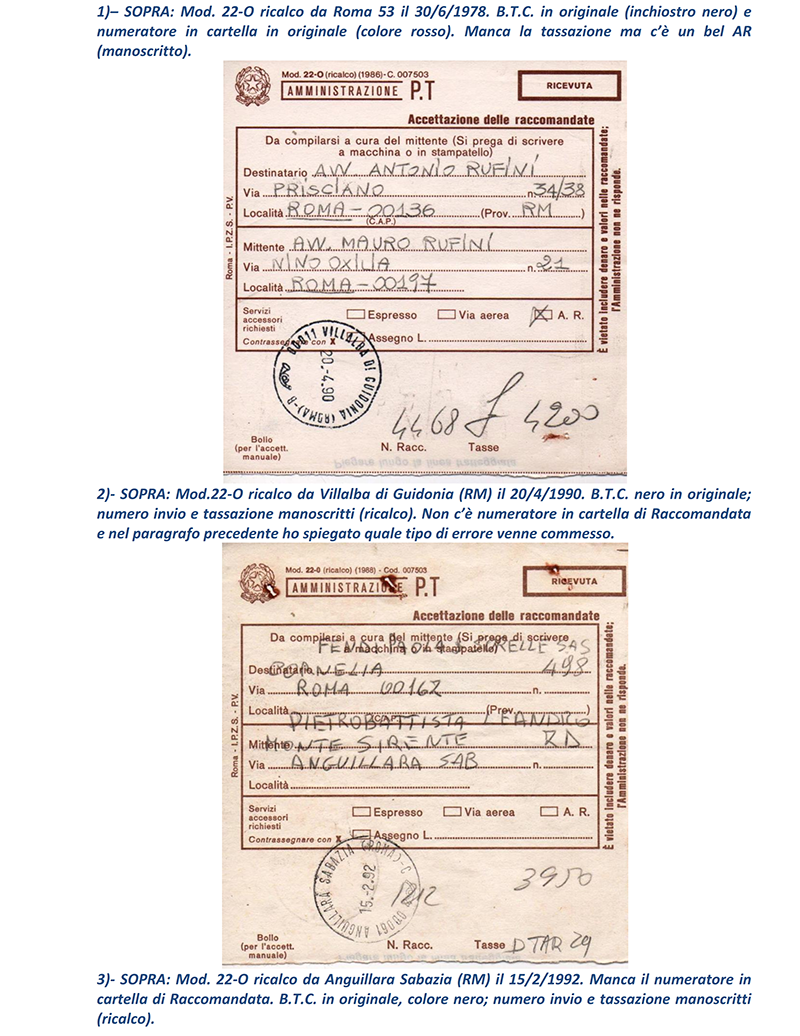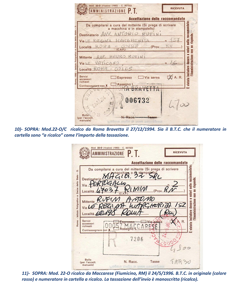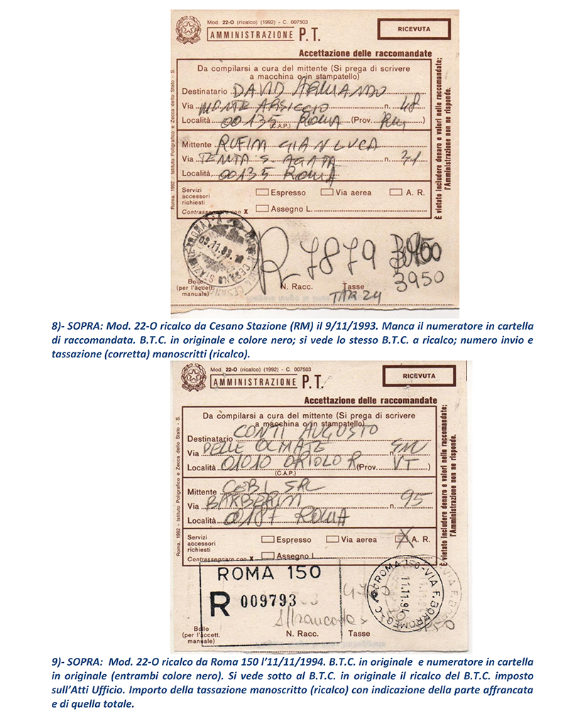 Ho terminato in sei puntate le vicissitudini delle Raccomandate in periodo repubblicano circolate “affrancate” con francobolli e mi avvio a presentare ai lettori, nelle prossime puntate, le altre casistiche di Raccomandate che analizzerò; ma mostrerò proprio nelle prossime puntate le Raccomandate circolate con affrancatura ed accettate con M.A. (Macchine Affrancatrici) sia solo accettanti che accettanti/tassanti oppure accettanti/tassanti/obliteranti delle Poste: il mondo fantastico ed indimenticabile delle “rosse”. NOTE: 1) – prima con numero dell’invio (e relativo Codice tipo EAN) sul retro della parte “Ricevuta” del Mod.22-R, poi con numero (e Codice tipo EAN) al recto della “Ricevuta” stessa.