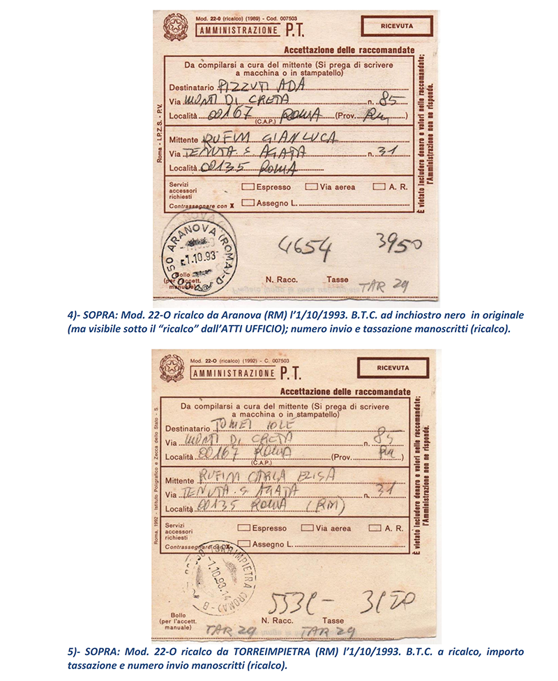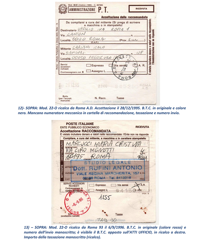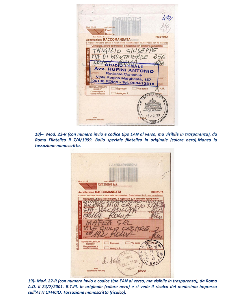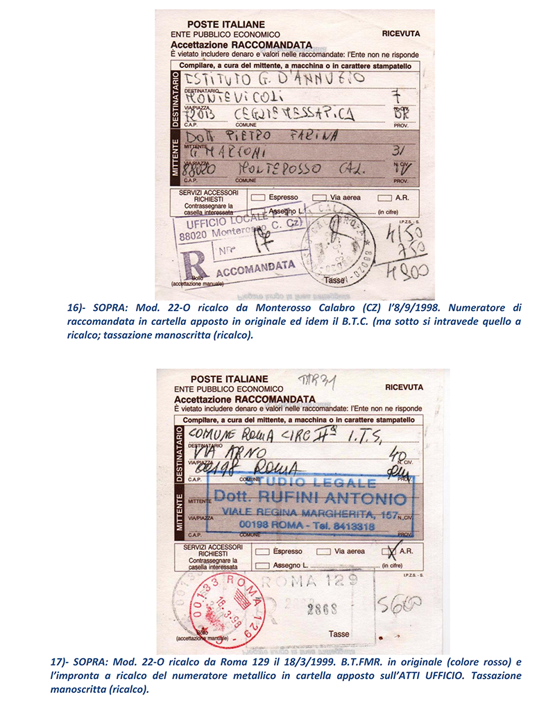 Ho terminato in sei puntate le vicissitudini delle Raccomandate in periodo repubblicano circolate “affrancate” con francobolli e mi avvio a presentare ai lettori, nelle prossime puntate, le altre casistiche di Raccomandate che analizzerò; ma mostrerò proprio nelle prossime puntate le Raccomandate circolate con affrancatura ed accettate con M.A. (Macchine Affrancatrici) sia solo accettanti che accettanti/tassanti oppure accettanti/tassanti/obliteranti delle Poste: il mondo fantastico ed indimenticabile delle “rosse”. NOTE: 1) – prima con numero dell’invio (e relativo Codice tipo EAN) sul retro della parte “Ricevuta” del Mod.22-R, poi con numero (e Codice tipo EAN) al recto della “Ricevuta” stessa.