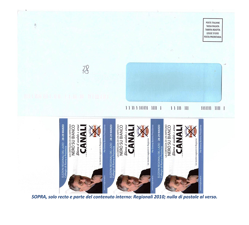 E’ affrancato da Posteitaliane e riporta la dizione di “postatarget”, quasi fosse stato inviato con tale servizio, incompatibile col timbretto relativo alla tariffa ridotta elettorale ed effettivamente pagata (€ 0,04) con l’impronta di M.A. Hasler, forse una F88 ma modificata per tassare in Euro.(2)
