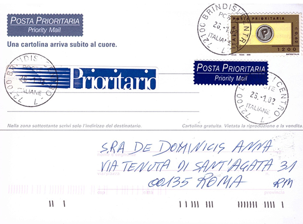 Per le altre tre attesi l’occasione propizia per spedirle da un po’ lontano dalla mia città, anche per “saggiare” il Prioritario e non avere tutte bollature di Uffici Romani o del CMP di Fiumicino. Il giorno 26/1/2002 (sabato) fui a Brindisi e dall’Ufficio Postale locale (“72100 BRINDISI CENTRO-7”) feci partire le cartoline (2) per Roma e chiesi ed ottenni in Posta che il guller d’ufficio fosse impresso anche al verso delle tre cartoline, ma in modo che colpisse sia il bordo che la foto interna stampata su carta, così che non potesse pensarsi, in futuro, di sostituire la foto con altre immagini. Da Brindisi sono tornato a Roma il giorno seguente 27 gennaio con l’aereo e il martedì successivo, in ufficio, ho trovato anche le belle cartoline spedite. Le mostro tutte e tre “inusata” e circolata, fronte/retro: La terza cartolina illustrata partita da Brindisi, è stata invece recapitata a mia suocera, con me convivente, il lunedì.