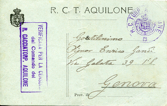 Cartolina in franchigia privata del Regio Caccia Torpediniere Aquilone inoltrata nel 1915 NOTA: [1] - Wikipedia - Attribuzione non conosciuta Samuel Rimoldi | ||||||||